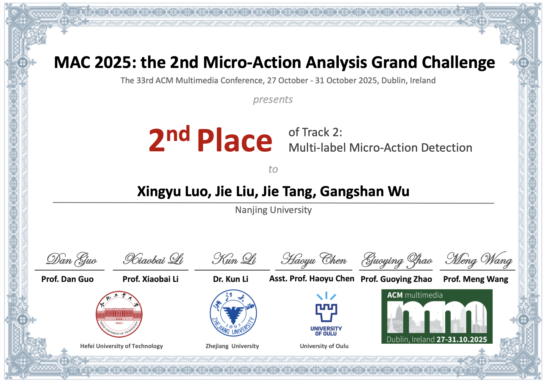 - 2025.10: Win the 2nd place in the MAC 2025: the 2nd Micro-Action Analysis Grand Challenge @ MM2025! 恭喜罗星宇同学(研一)!